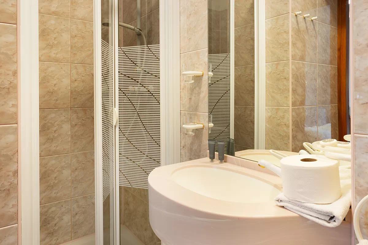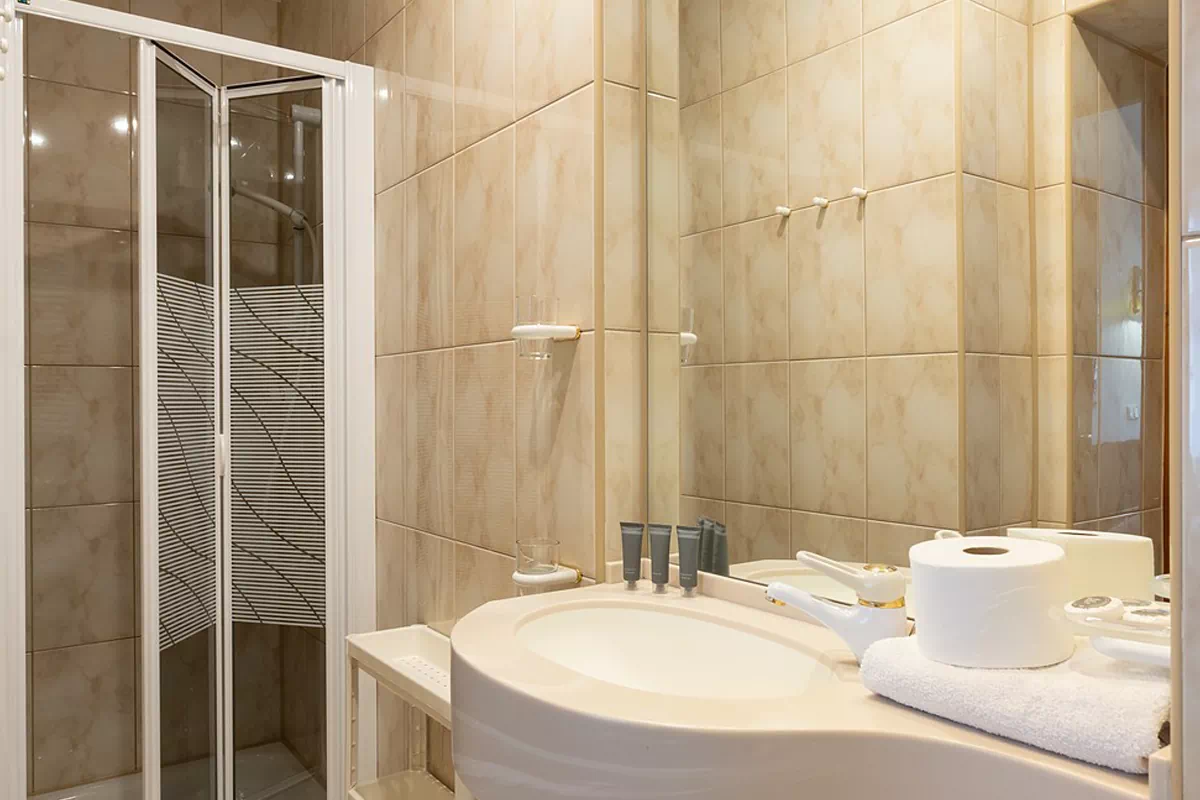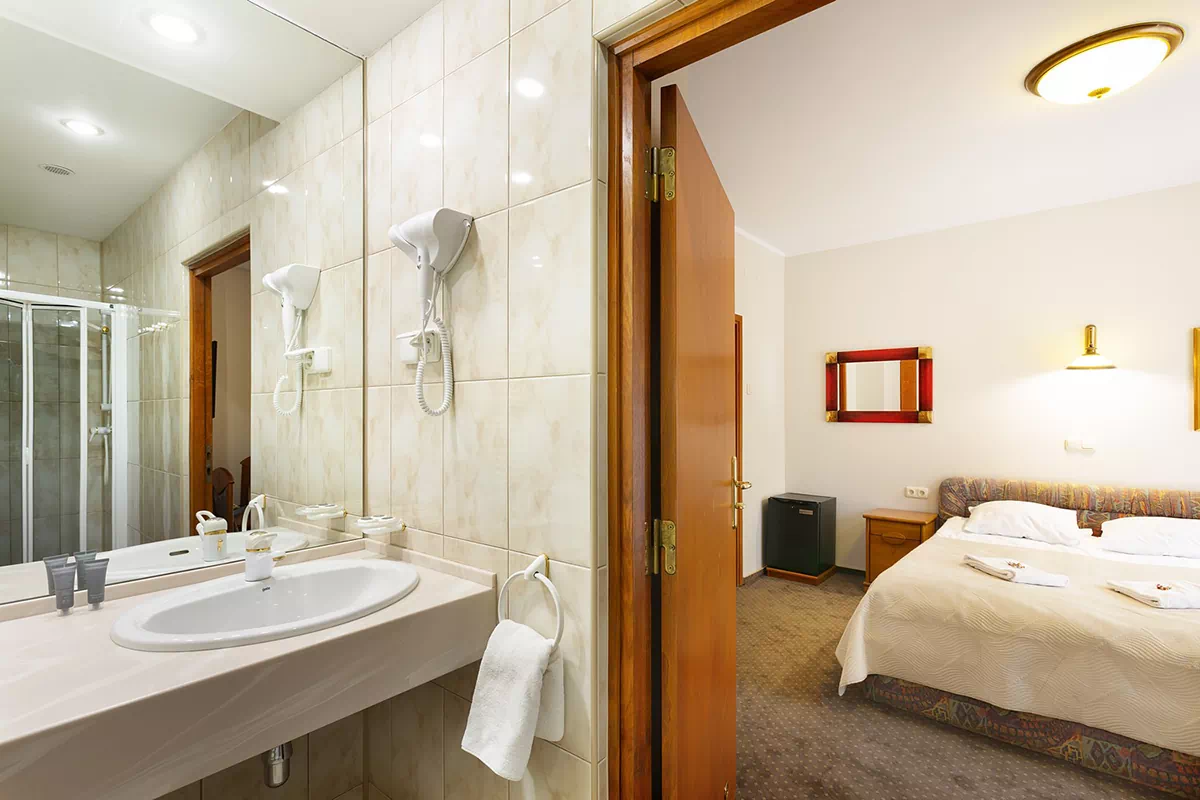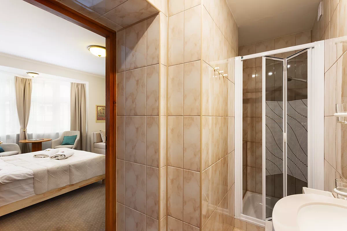 Pokój dwuosobowy z łóżkiem podwójnym z łazienką z prysznicem.